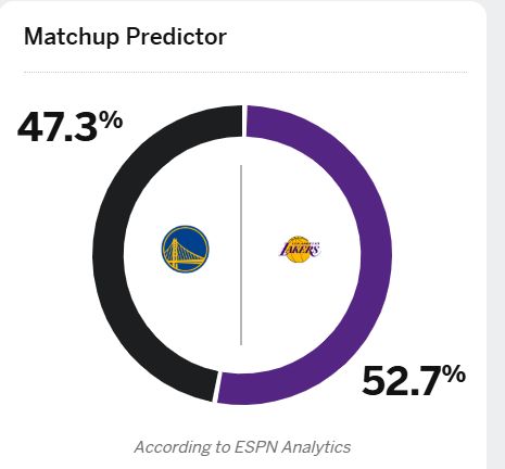 湖人将在主场迎战勇士,ESPN对这场比赛进行了预测:湖人赢球的概率是52.7%,勇士赢球的概率是47.3%。