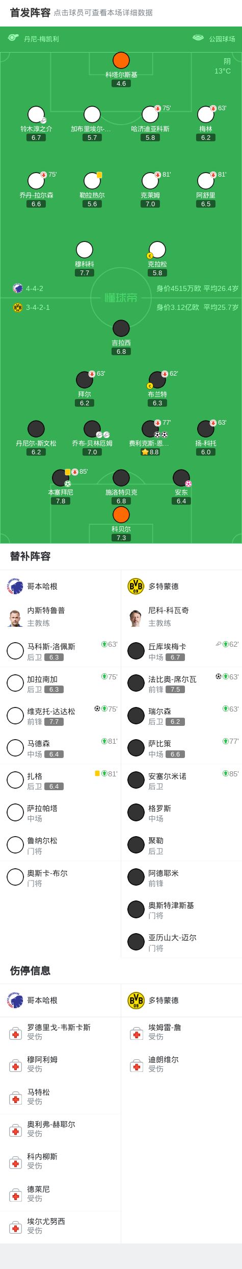 北京时间10月22日欧洲冠军联赛 联赛阶段 第3轮,哥本哈根对阵多特蒙德。哥本哈根维克托-达达松破门。多特蒙德费利克斯-恩梅加梅开二度,法比奥-席尔瓦破门,本塞拜尼破门,安东自摆乌龙。最终比分哥本哈根 2-4 多特蒙德。